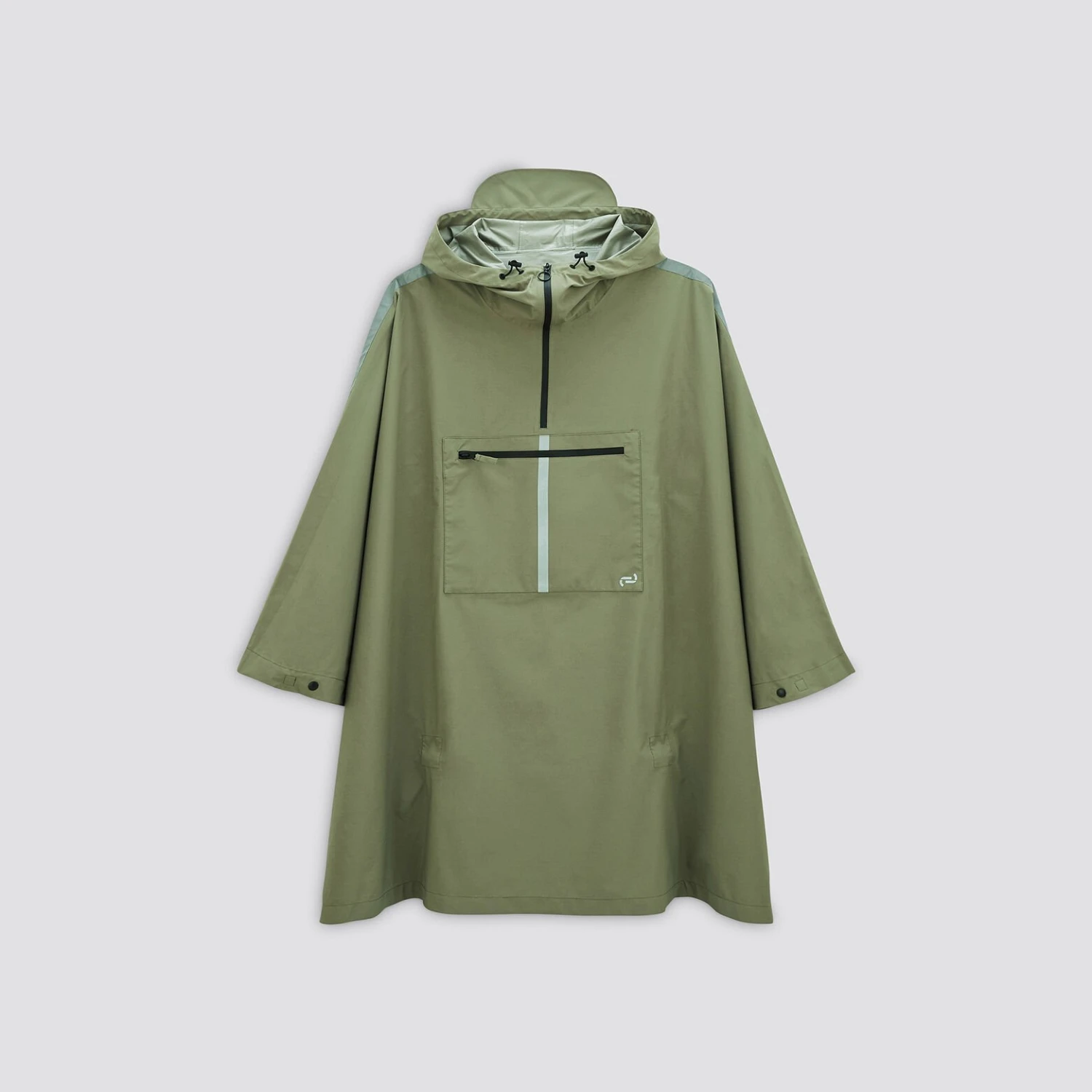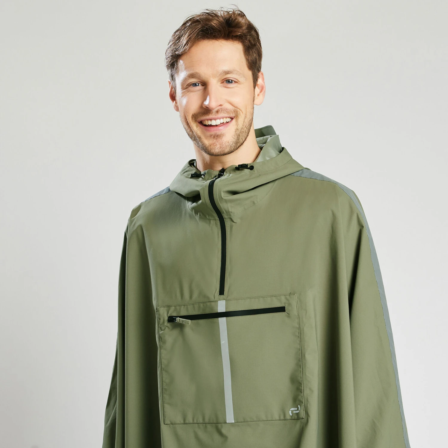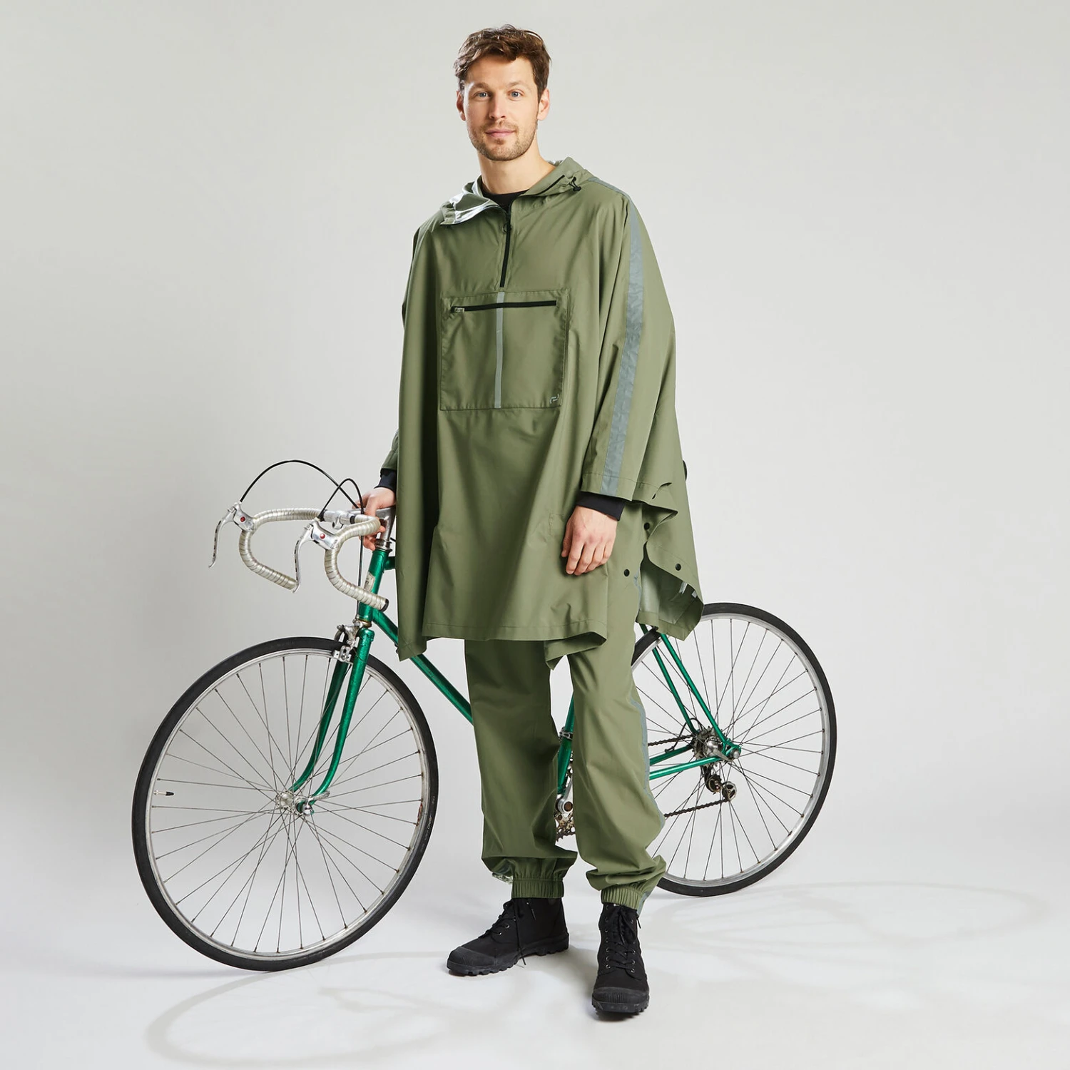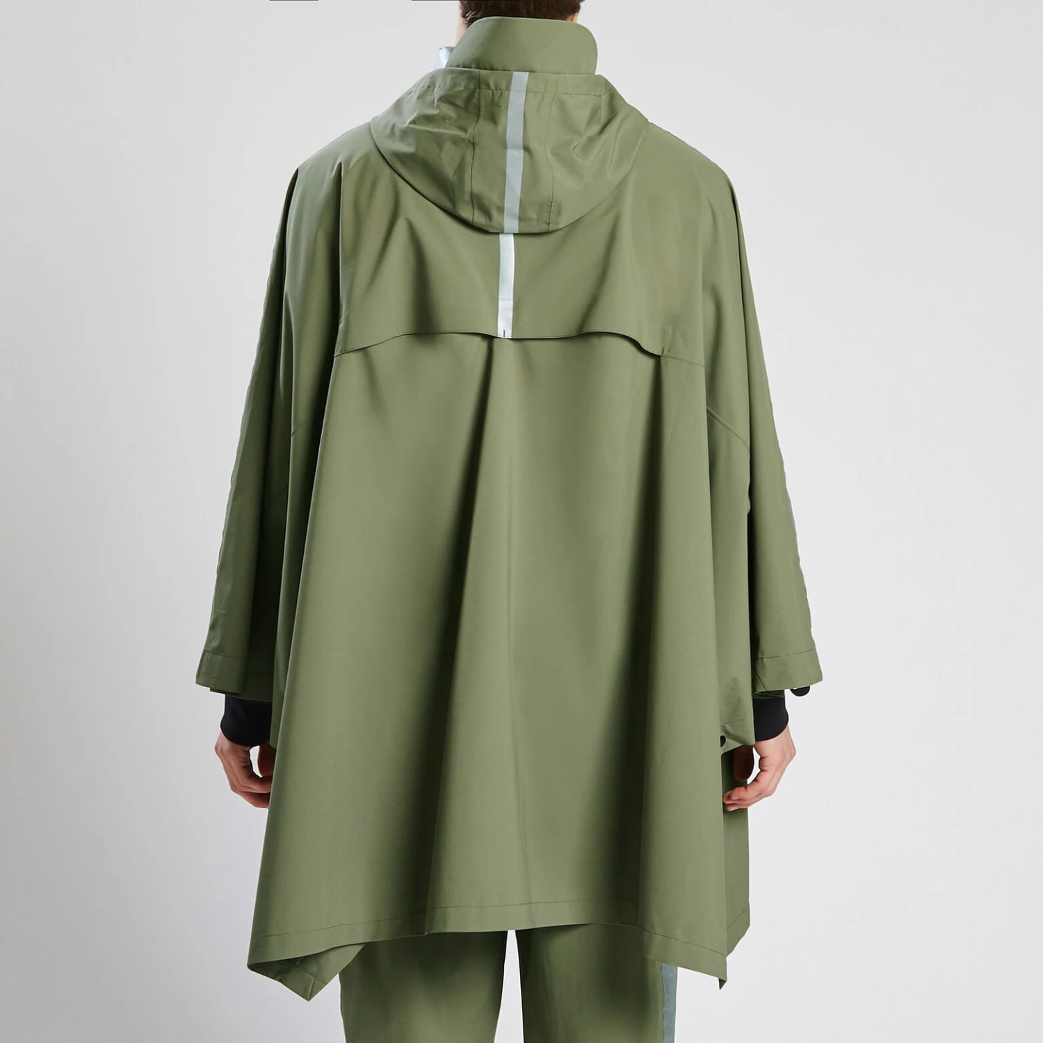Cette cape de pluie possède une capuche resserrable, une fermeture zippée, une poche zippée sur le devant et des élastiques de maintien en bas et sur les manches. La cape peut se replier dans la poche pour le transporter partout facilement.