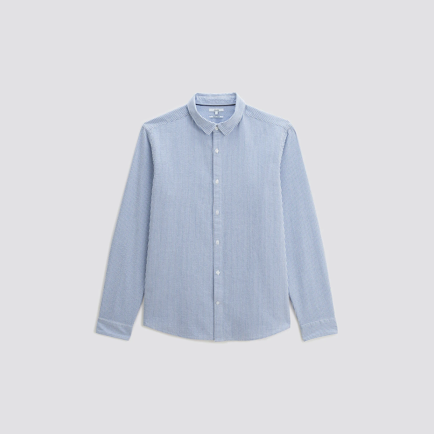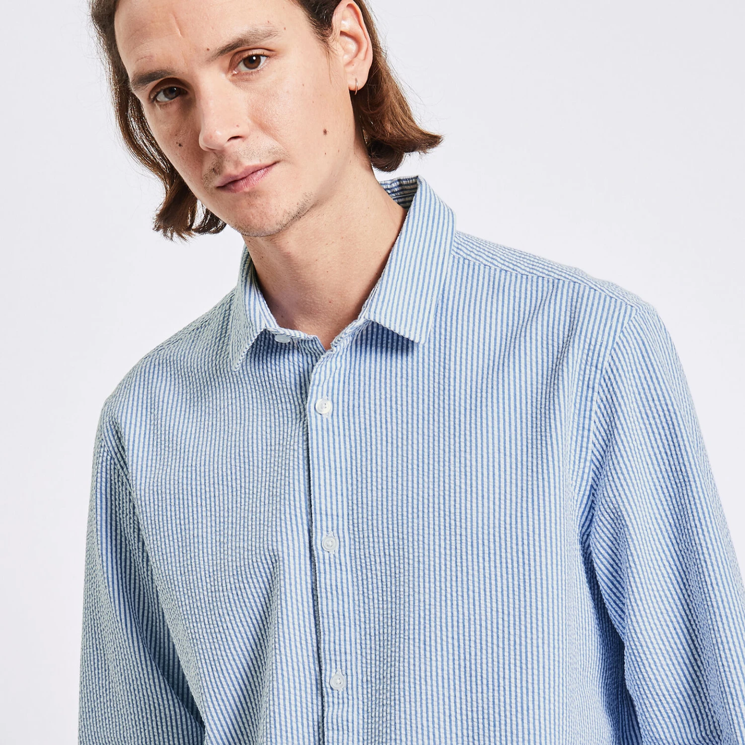 Confectionnée dans un coton seersucker, tissu gaufré, cette chemise à rayures fait partie des indispensables du vestiaire masculin !