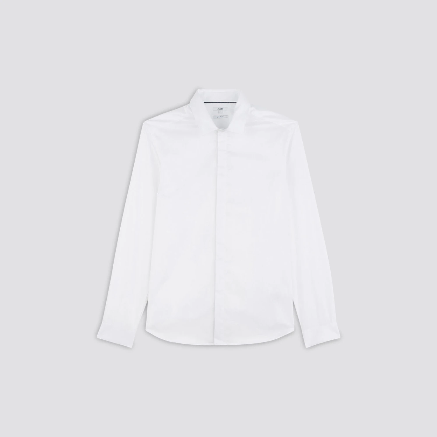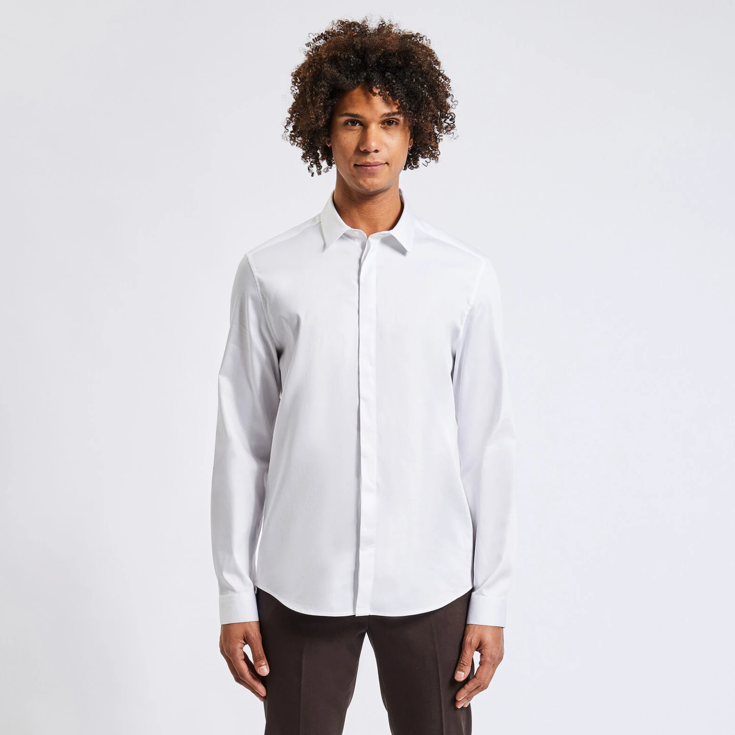Cette chemise unie est confectionnée en satin de coton qui allie la douceur du coton à l¿aspect uni, lisse et brillant de son tissage. Fibre naturelle, le coton est léger et respirant. Elle possède une fermeture boutonnée sous patte, idéale pour les occasions élégantes.