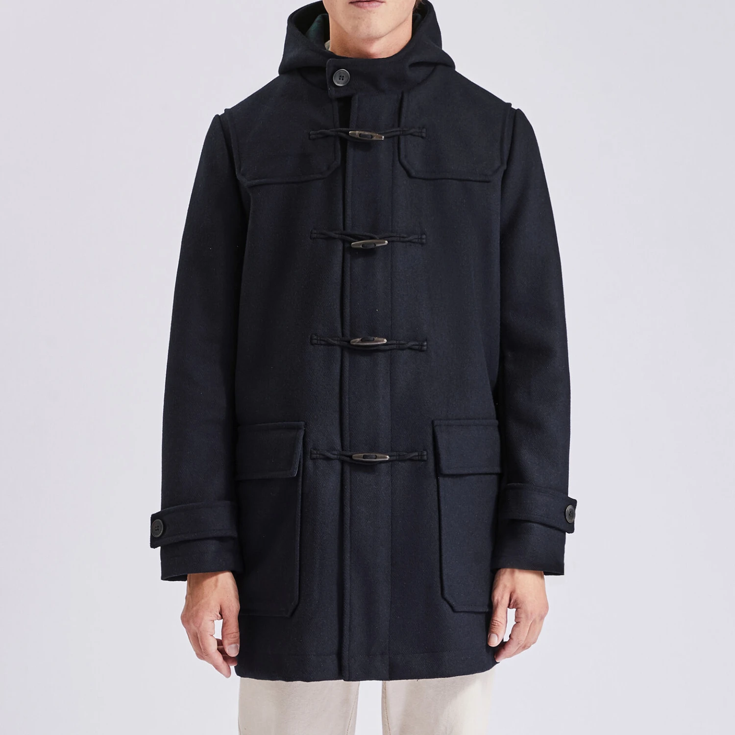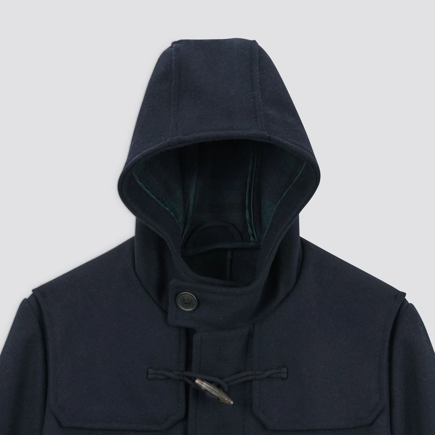 Ce manteau reprend tous les codes du duffle-coat : le tissage épais en laine mélangée, les attaches brandebourg, la capuche et les deux grandes poches plaquées à rabat. Une poche intérieure vient le compléter, ainsi qu’un intérieur à carreaux fantaisie. Le col est boutonné et les bas de manches possèdent des pattes de boutonnage. Sa fermeture est zippée.