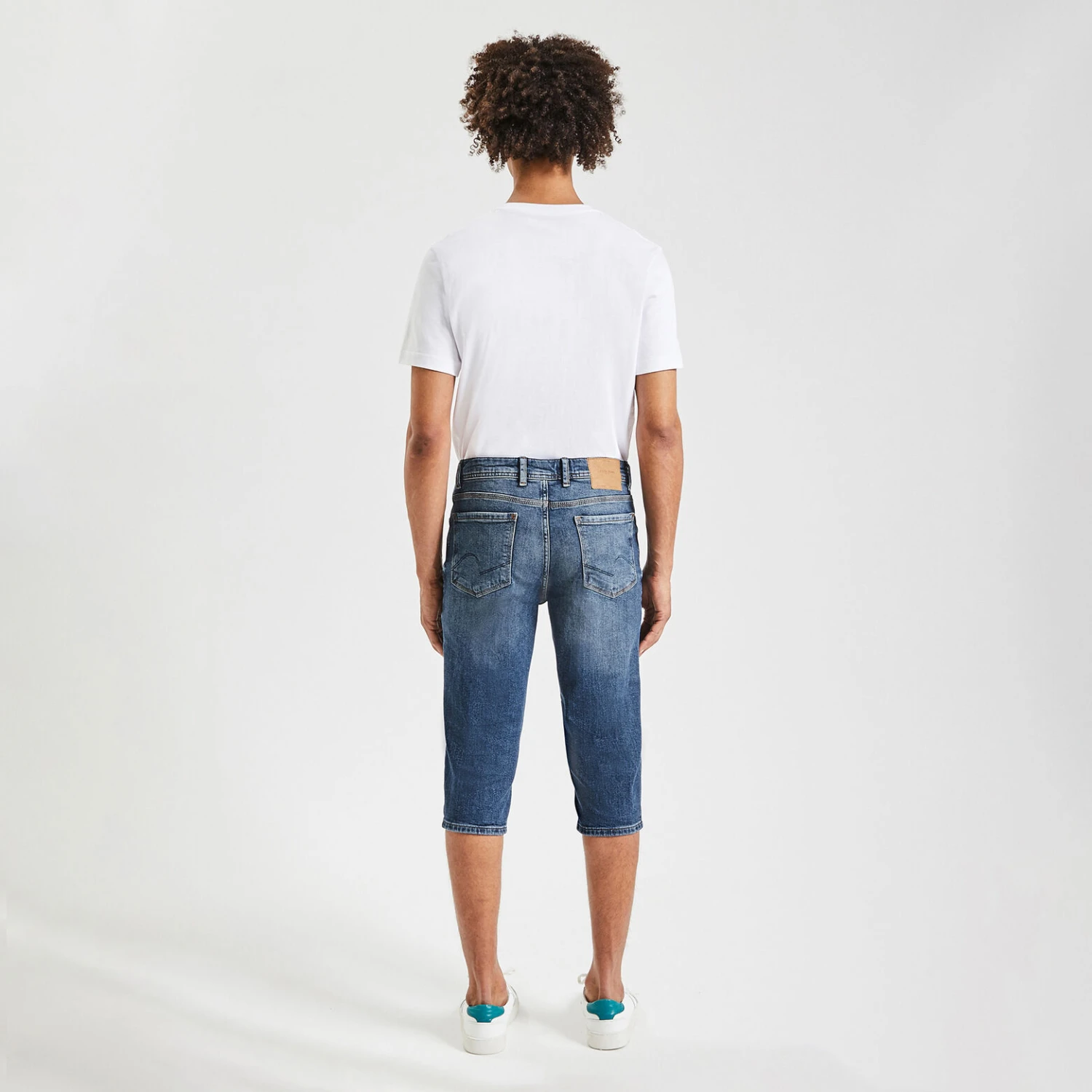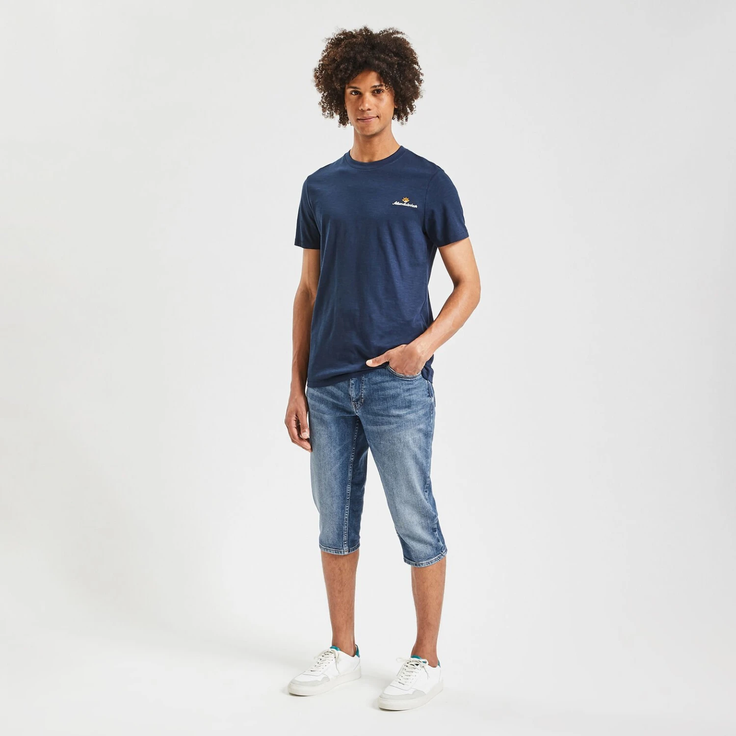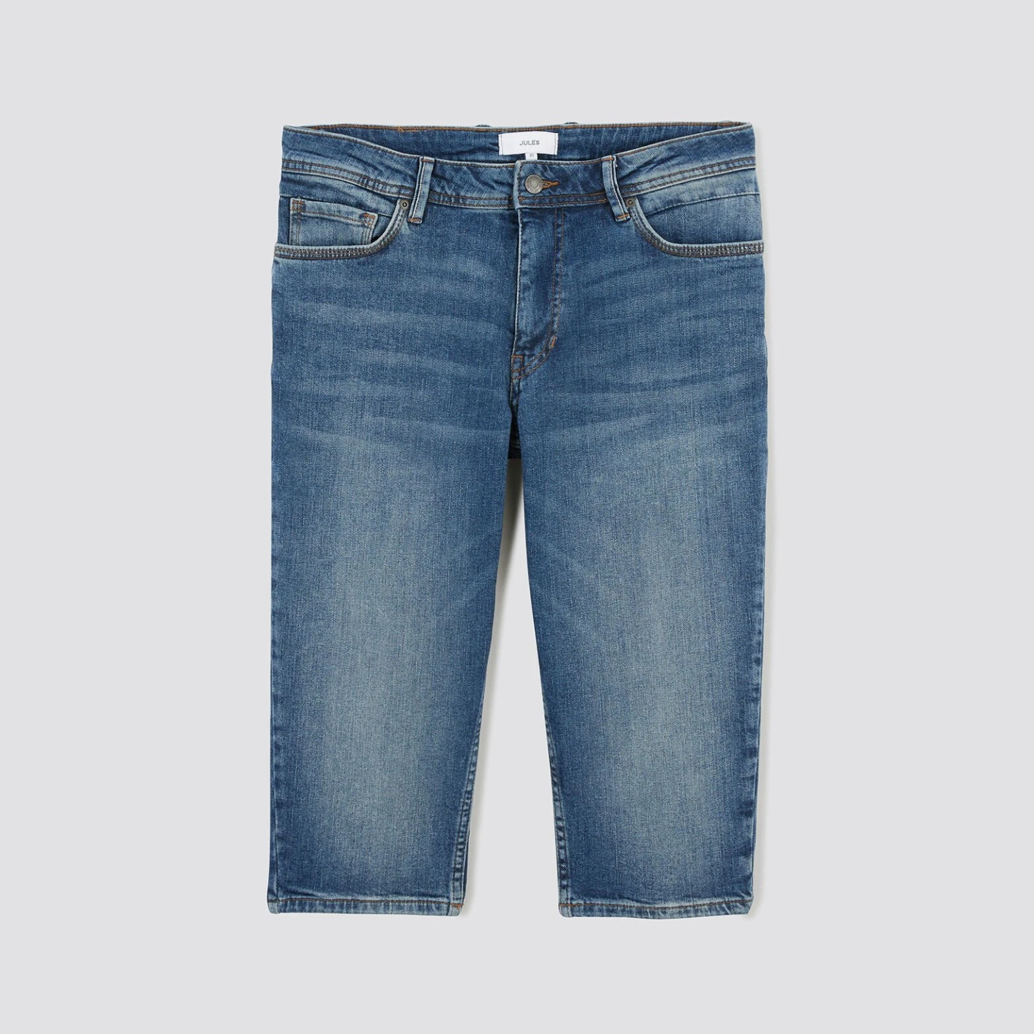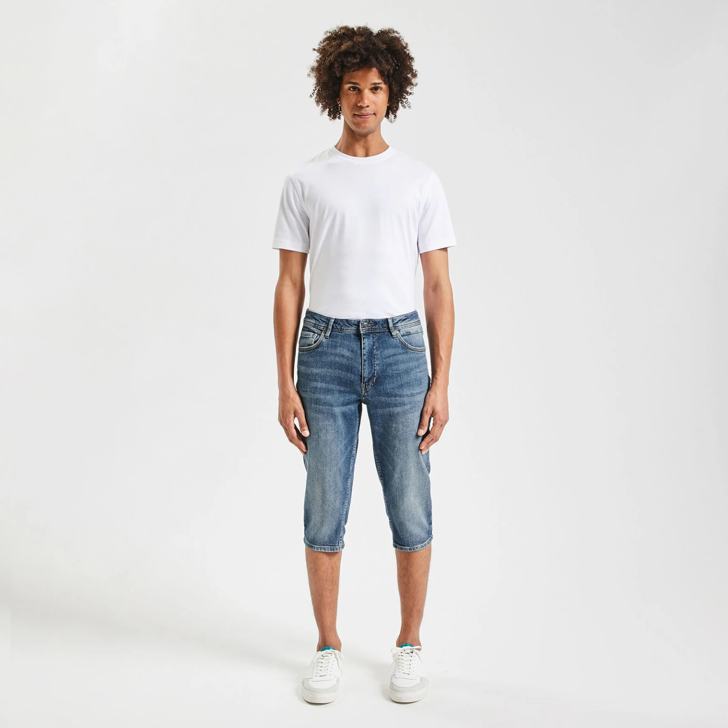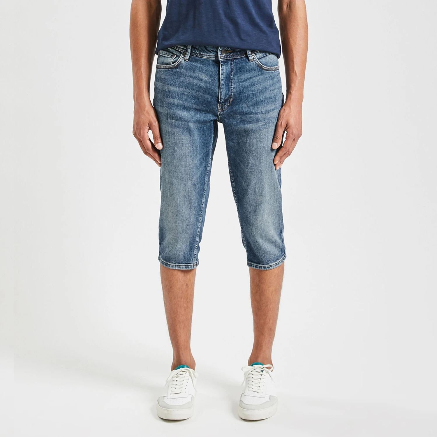 Un pantacourt en denim, qui arrive sous le genou, parfait pour cet été. Sa matière, composée en partie de coton recyclé, assure une durabilité dans le temps.