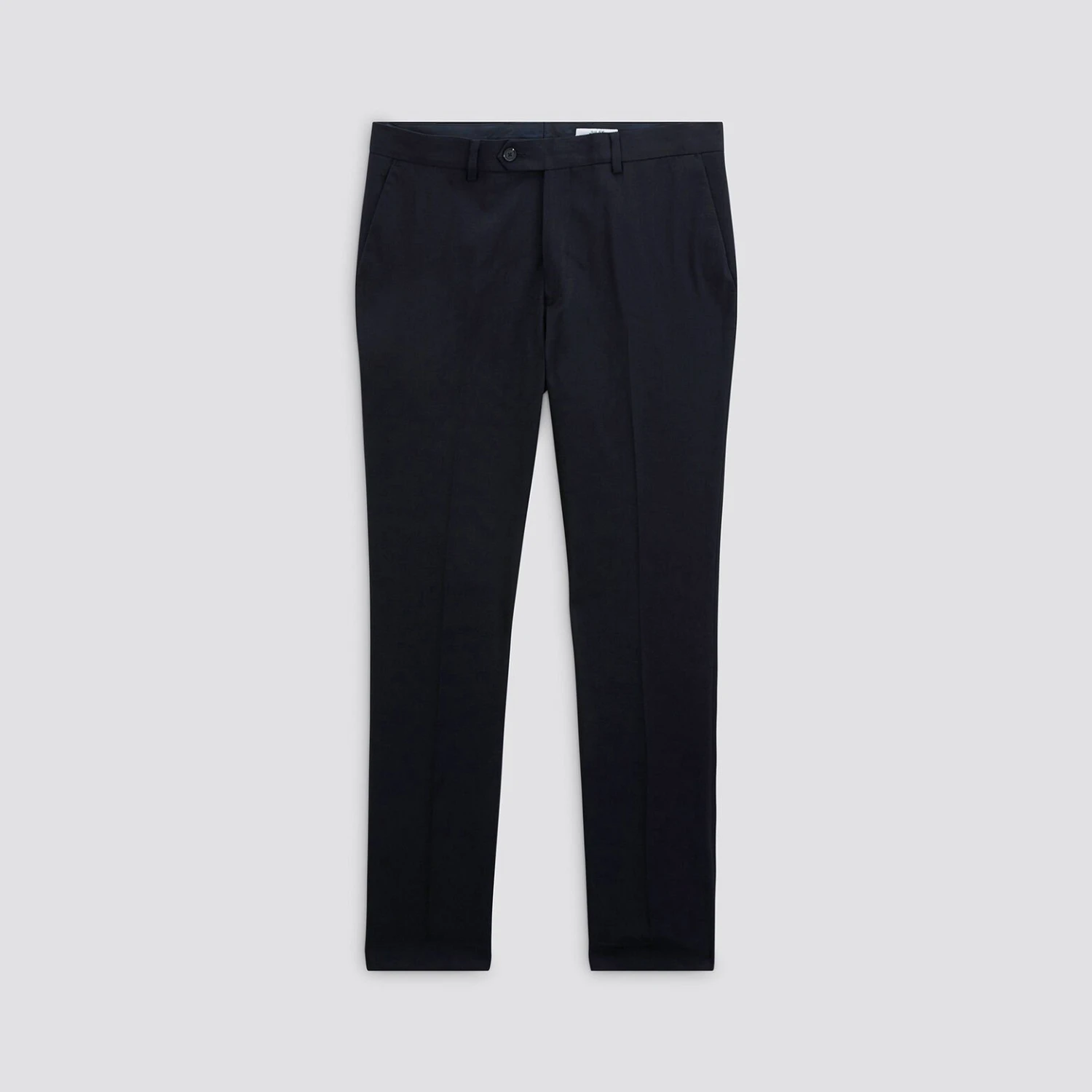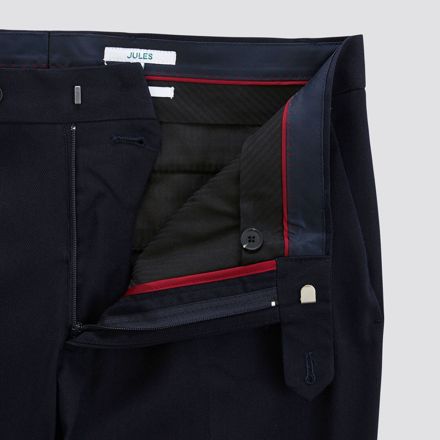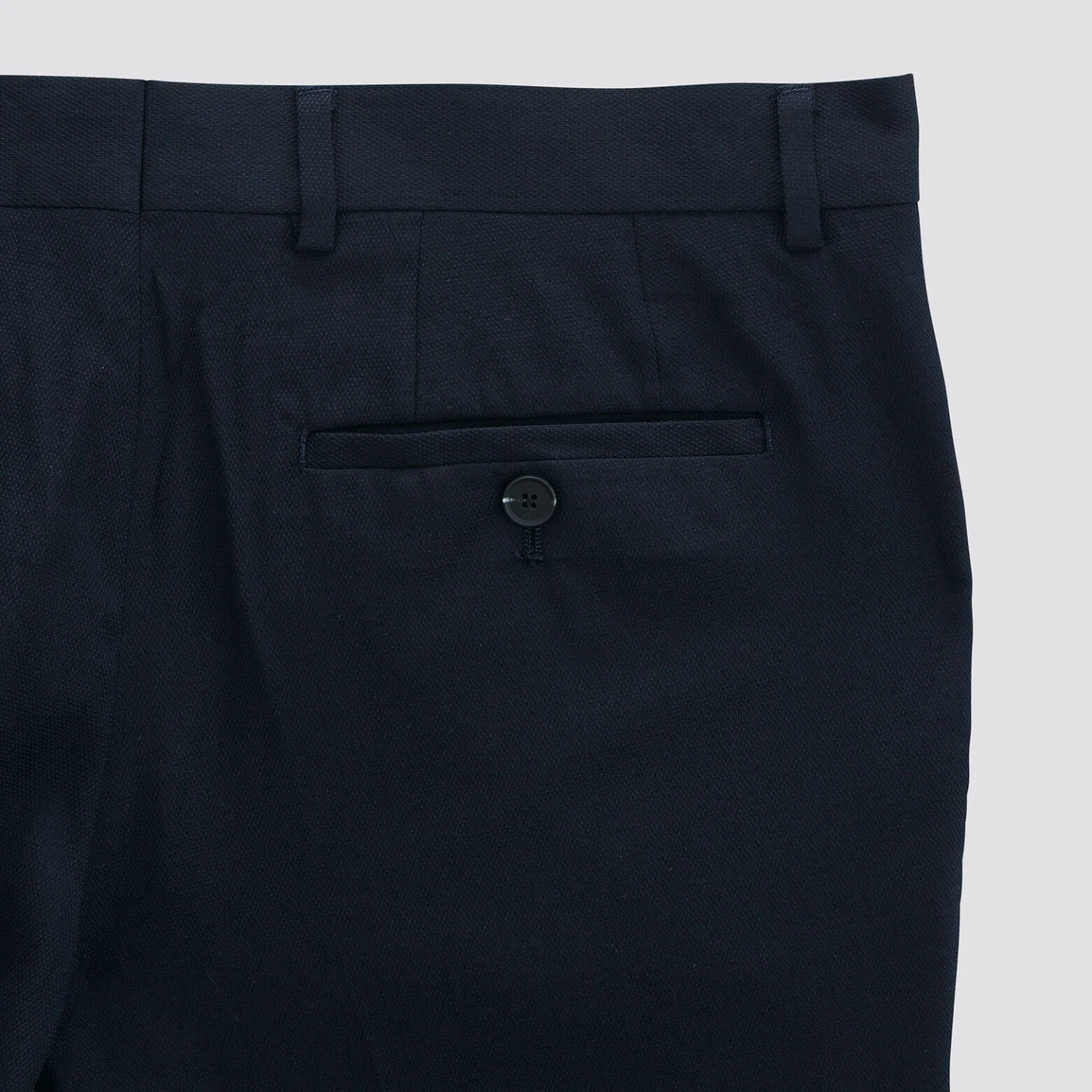 Ce pantalon de costume, moderne, sur une coupe regular, a été confectionné dans un tissu contenant de l’élasthanne, gage de tenue, d’élégance et surtout de confort. Il possède une fermeture bouton, 2 poches italiennes devant, 2 poches revolver simple passepoilées à l’arrière et une ceinture avec anglaise.