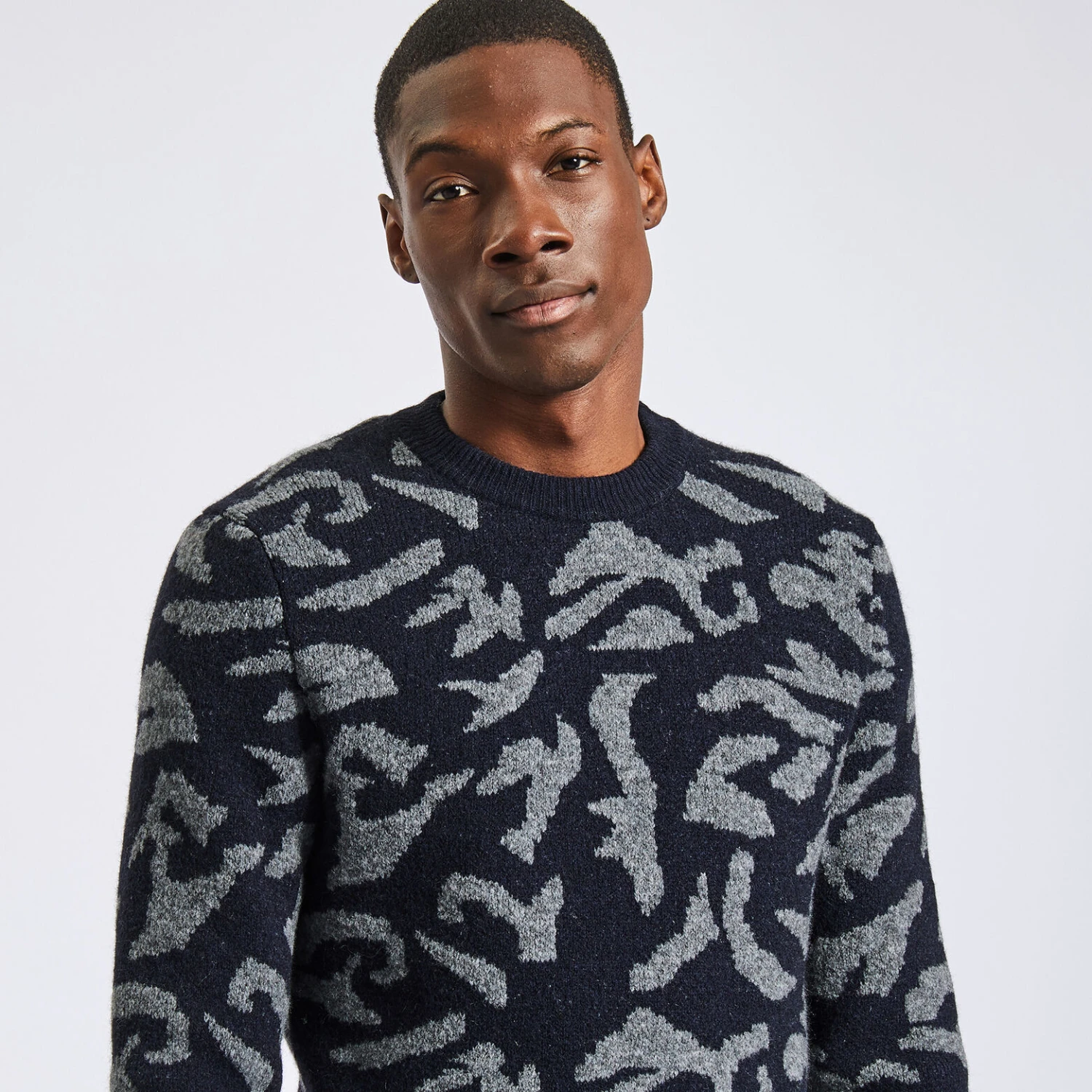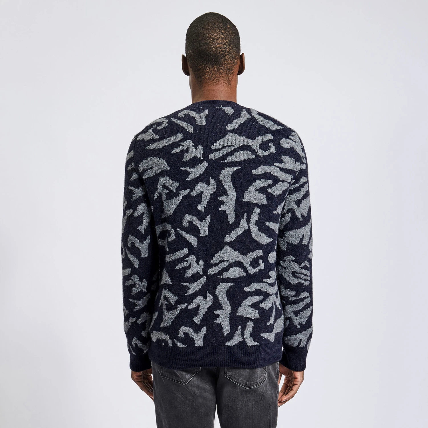 Ce pull en laine jacquard camouflage possède un col rond en côtes, un bas de corps et des bas de manches en bord-côtes et une coupe regular, pour un porté cool et décontracté.