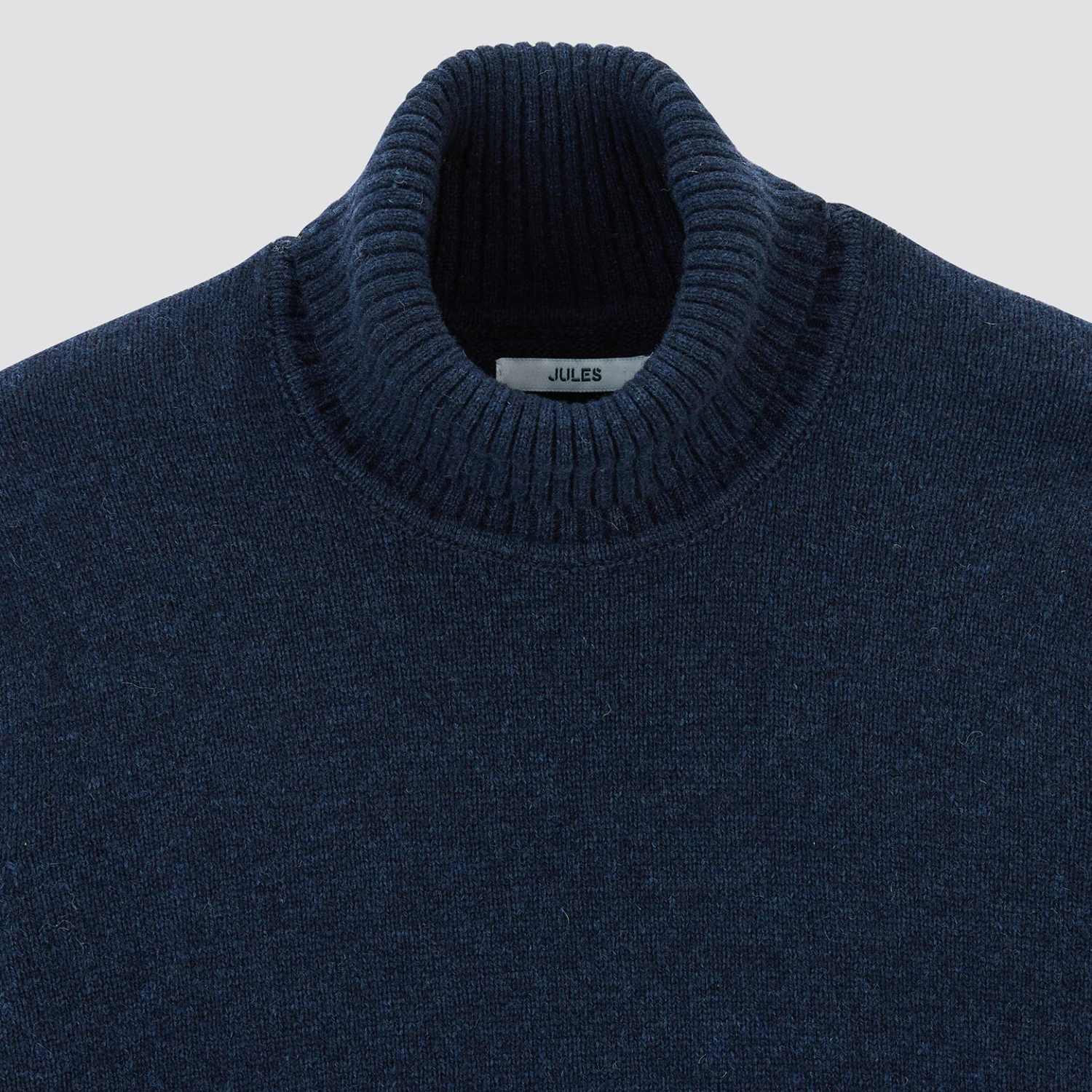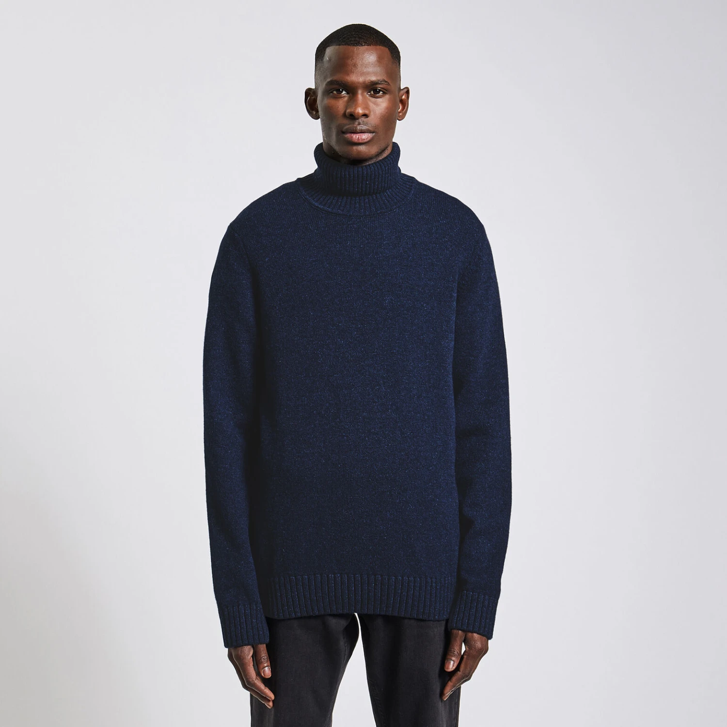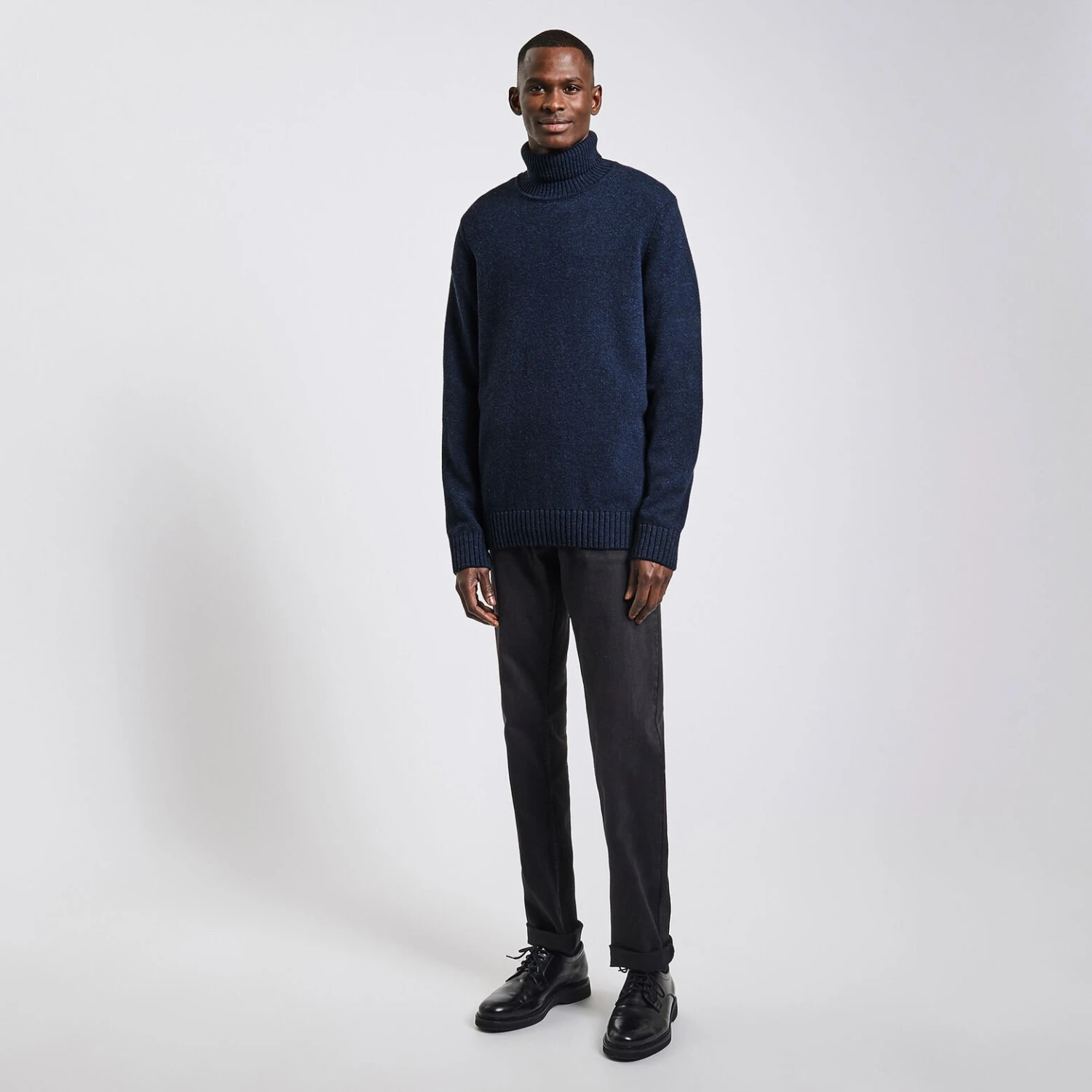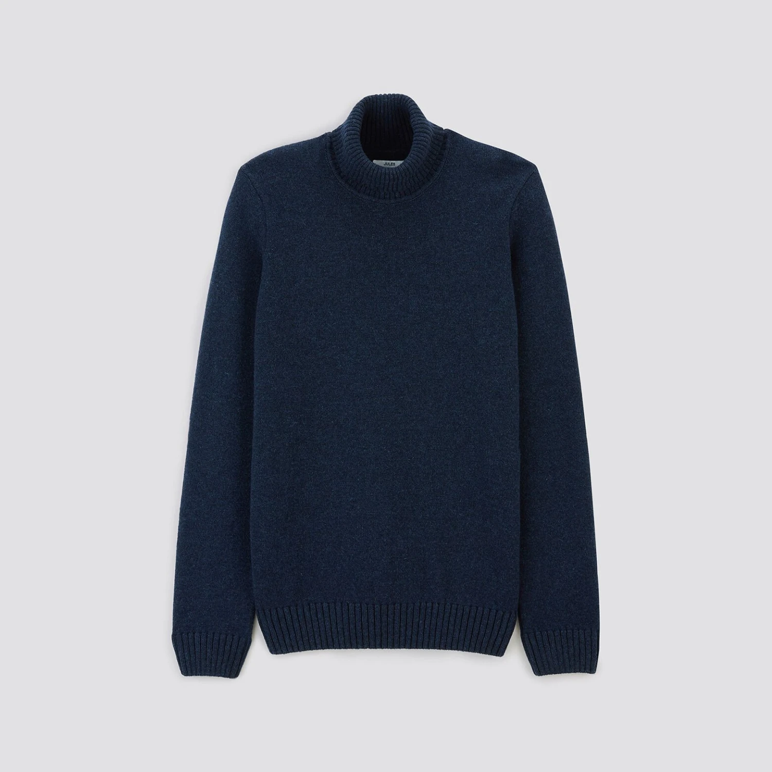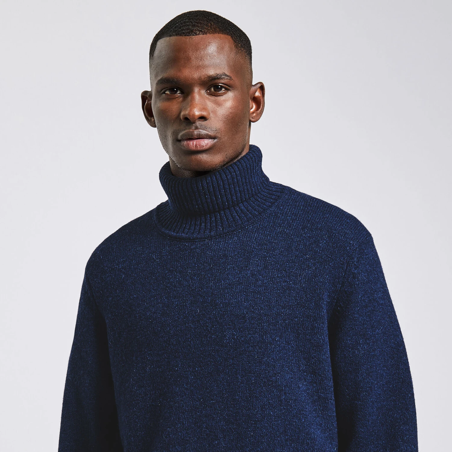 Ce pull à col roulé est fabriqué au Portugal, dans une maille tricotée en laine. Il possède des bas de manche et un bas de corps en bord-côtes. Sa coupe est regular, pour un porté cool et décontracté.