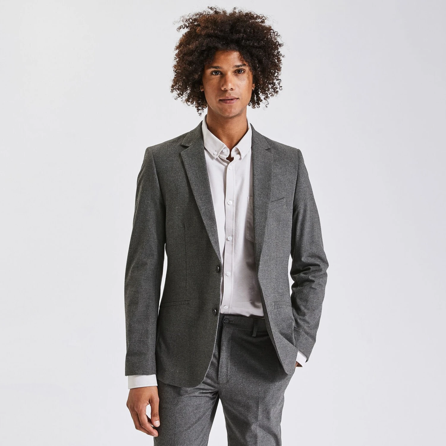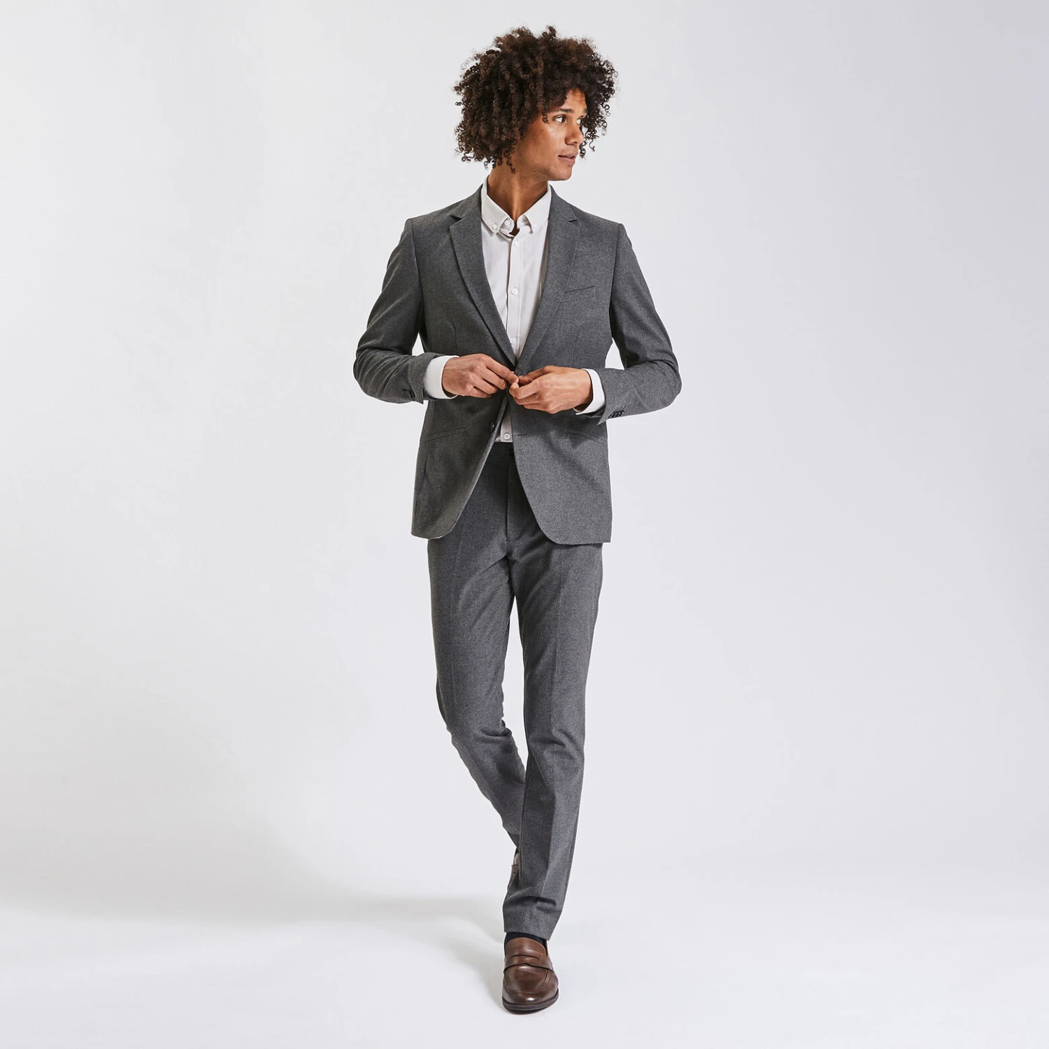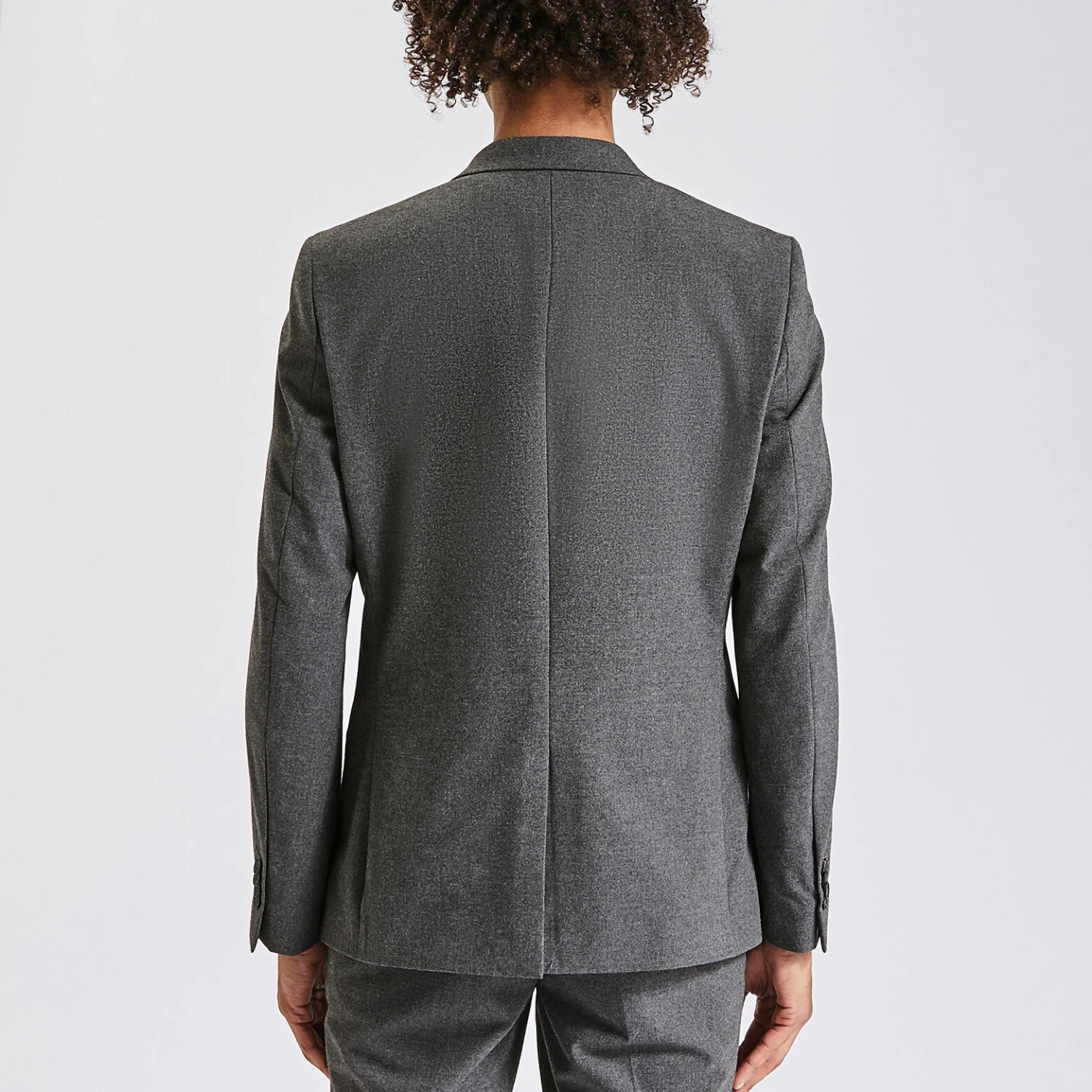 Cette veste de costume slim flanelle possède une fermeture deux boutons, deux poches passepoilées cousues sur le devant, une poche cousue poitrine et deux poches intérieures. Les bas de manches sont boutonnés. Cette veste contient de l’élasthanne pour plus de confort.