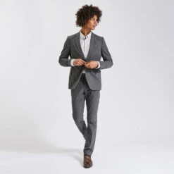 Confectionnée au Maroc dans un tissu prince de galles gris, cette veste de costume est une pièce maîtresse du dressing masculin.