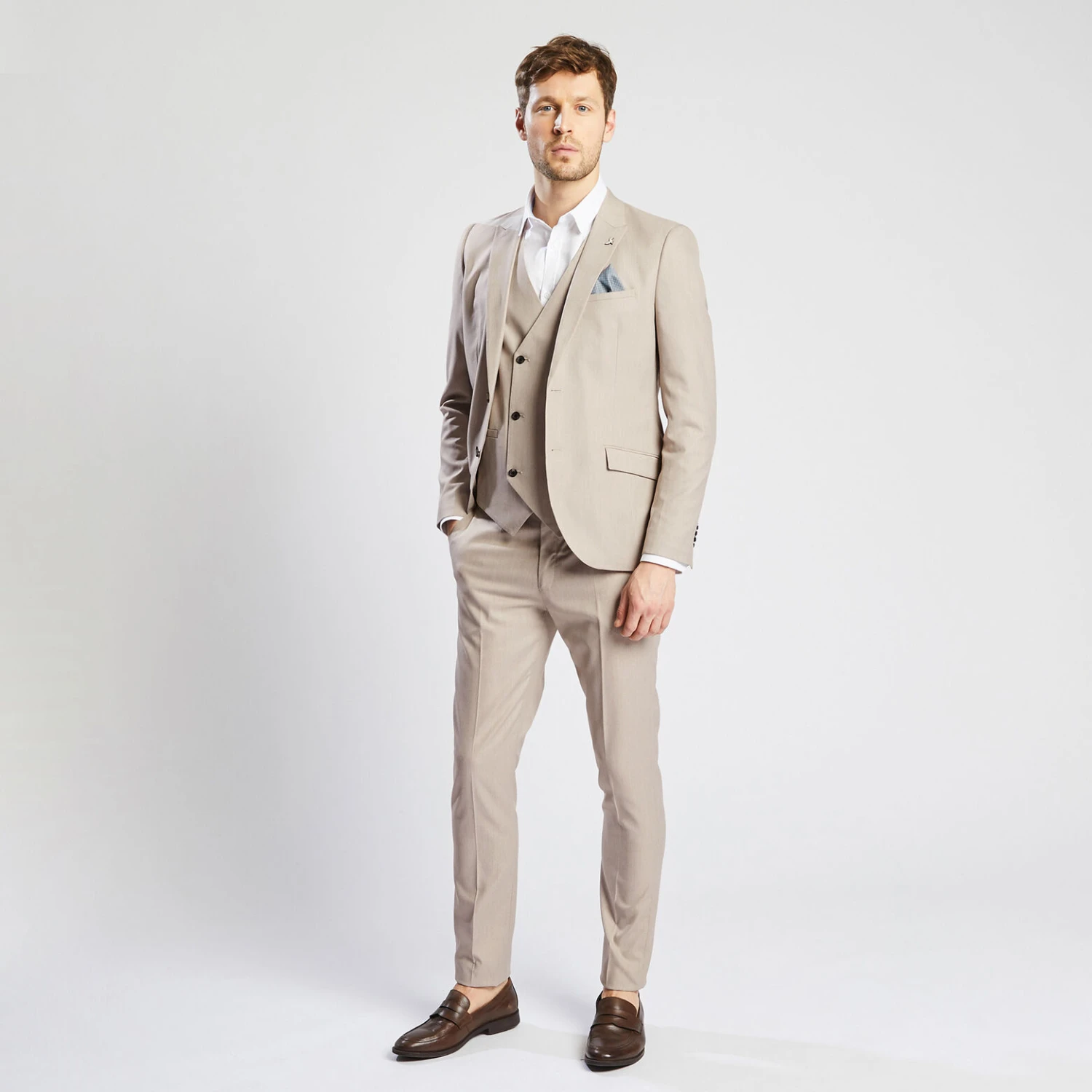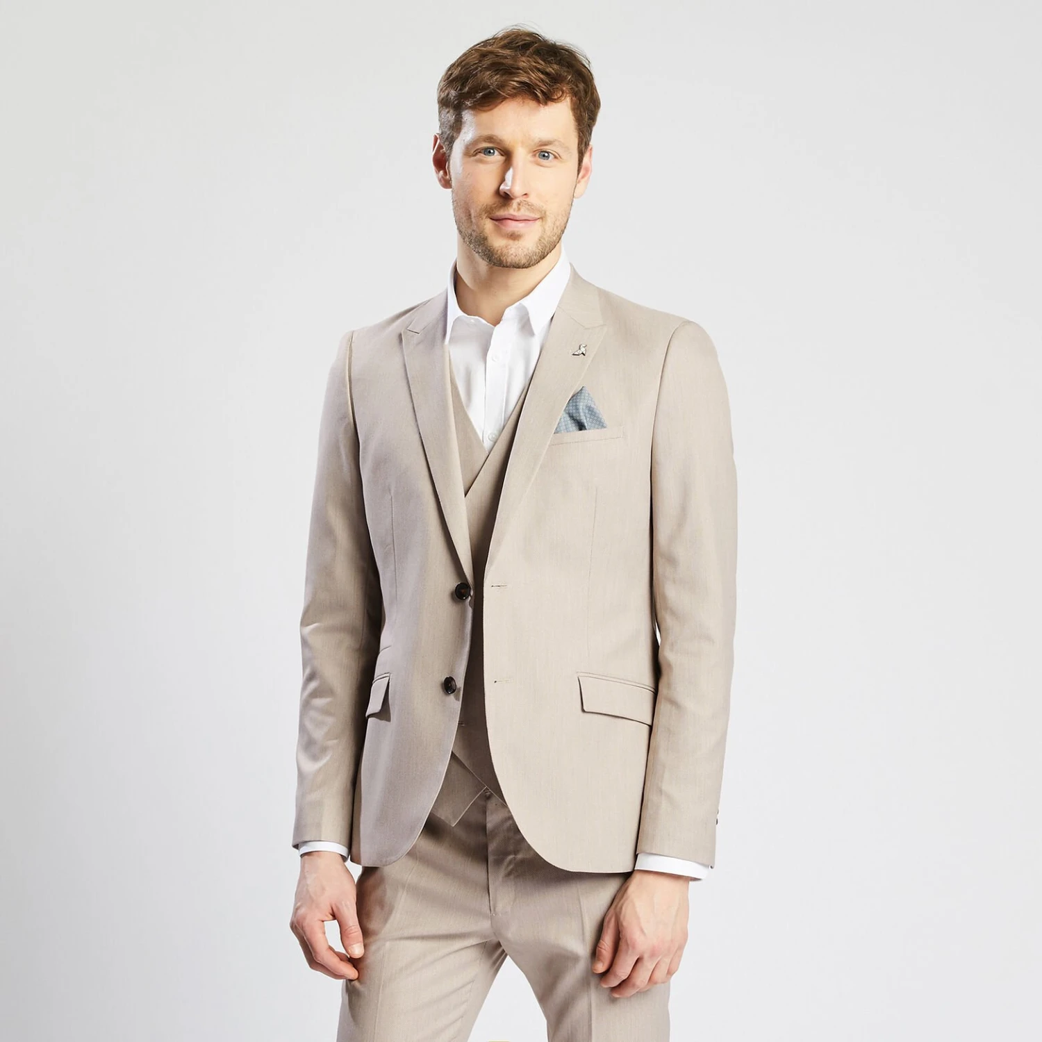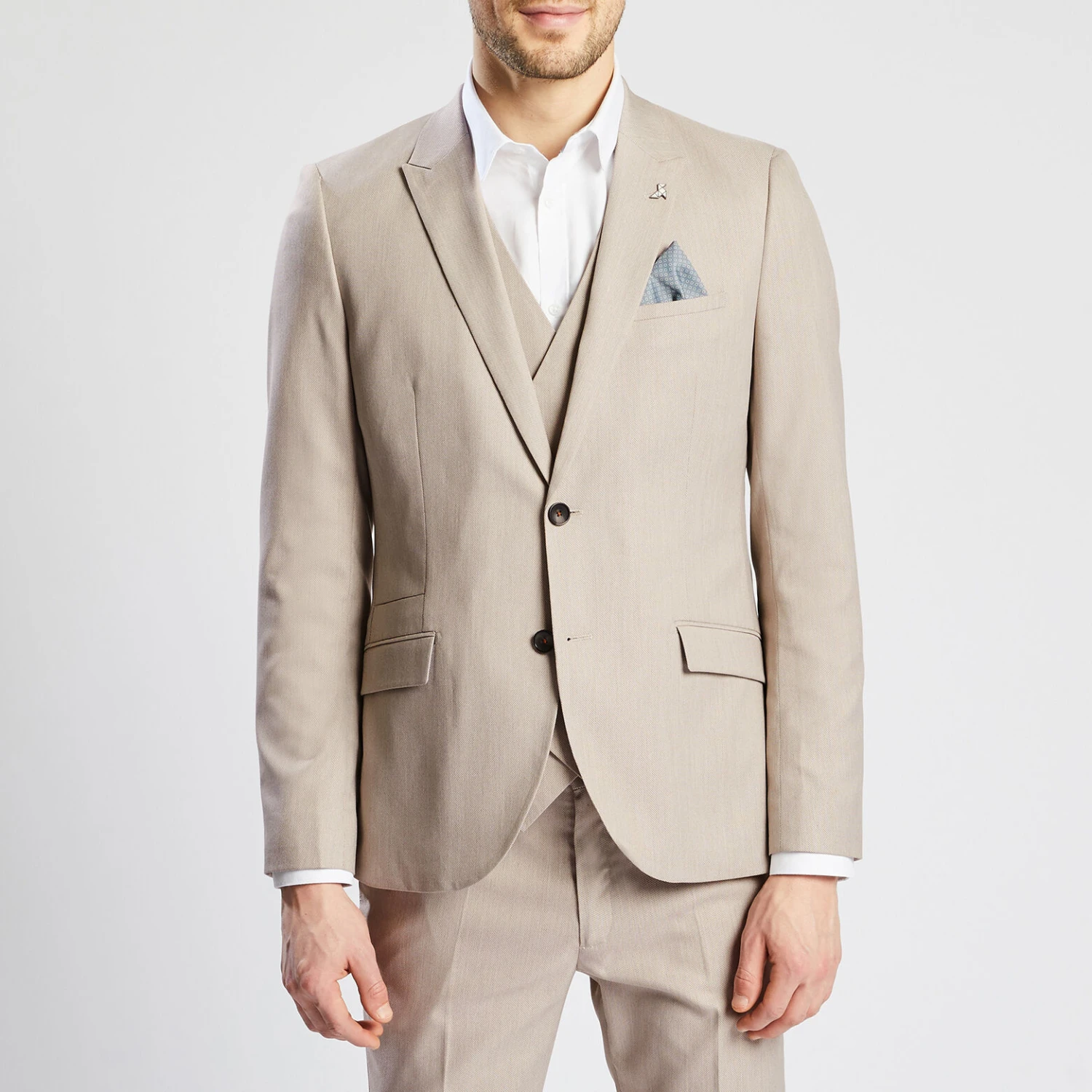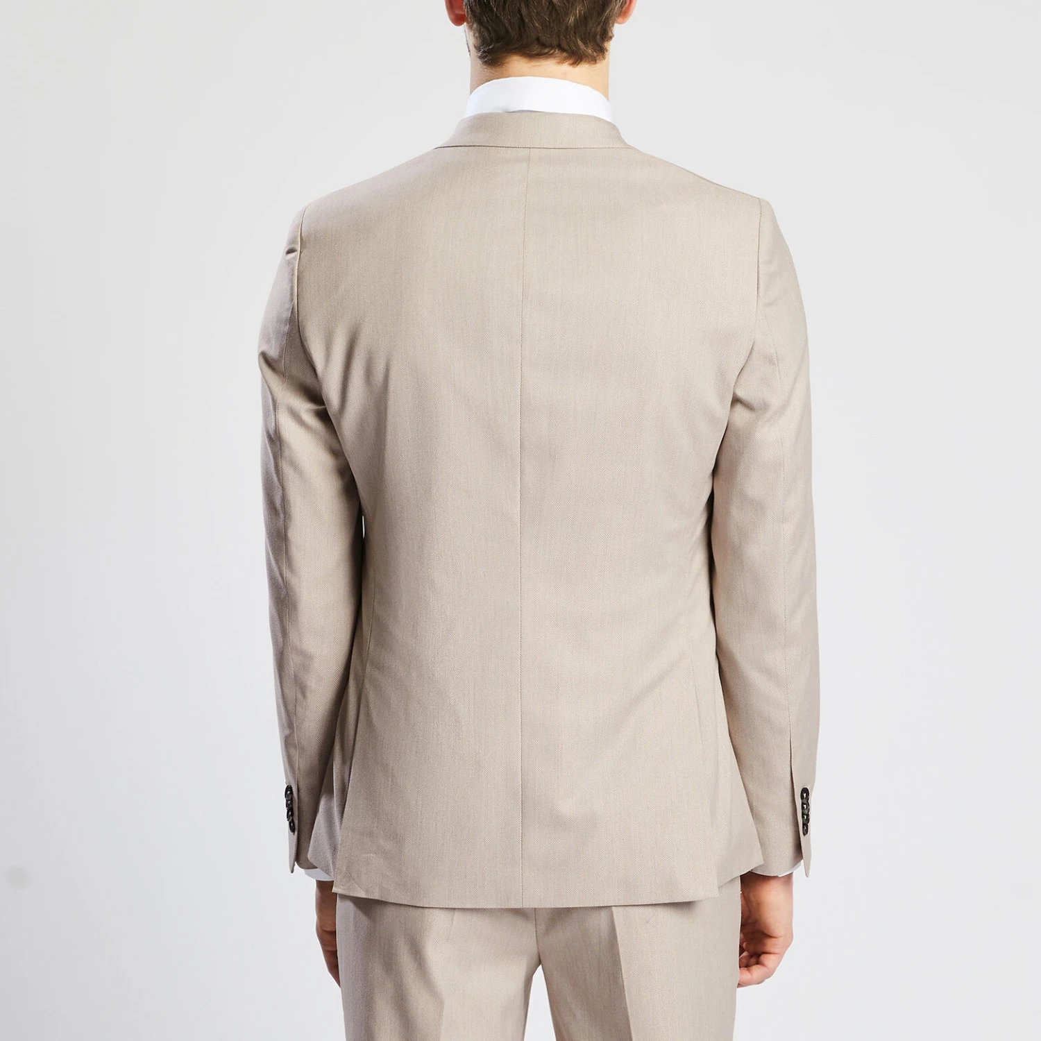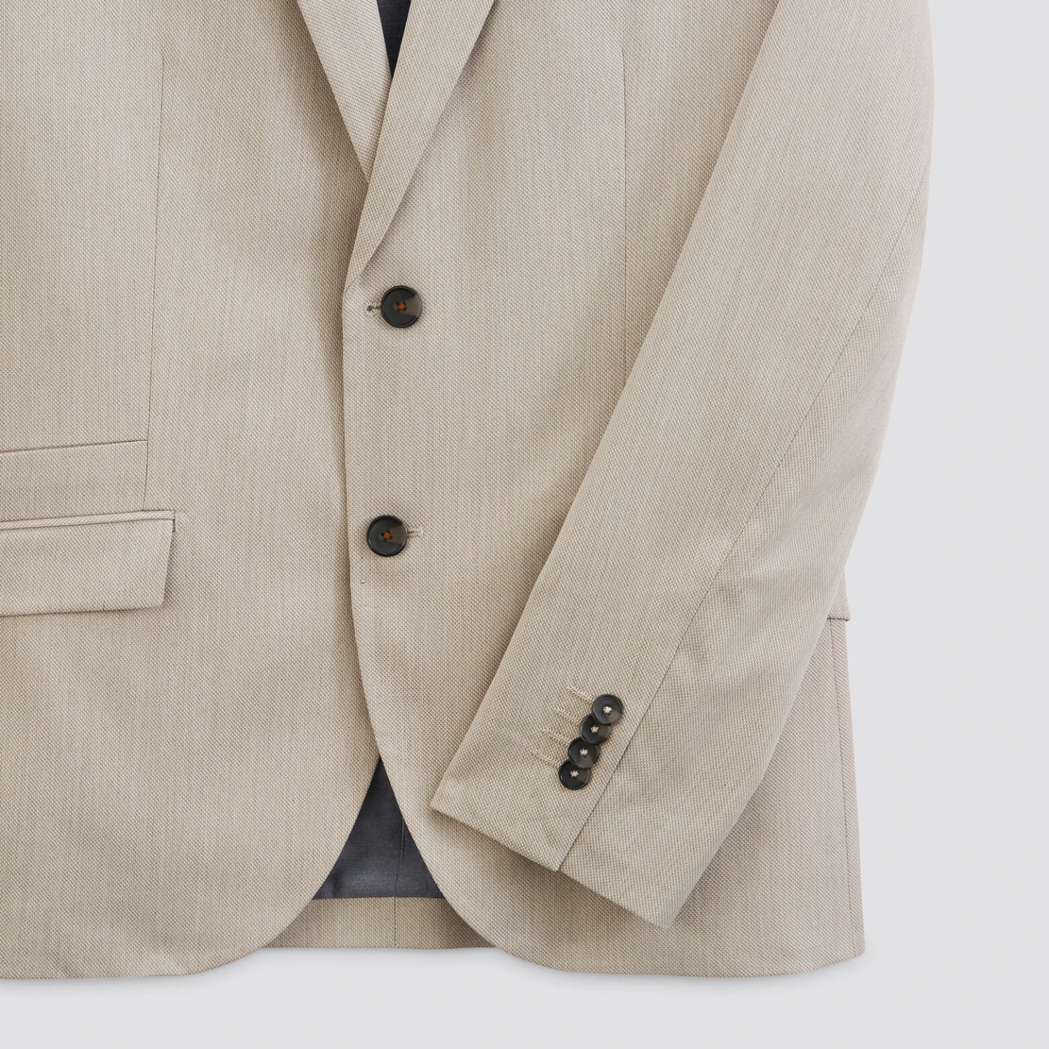 Cette veste, avec fermeture deux boutons, dispose de bas de manches quatre boutons, deux poches à rabats sur le devant, une poche poitrine passepoilée et deux poches intérieures. Sa coupe est slim. Cette veste contient de l’élasthanne pour plus de confort
